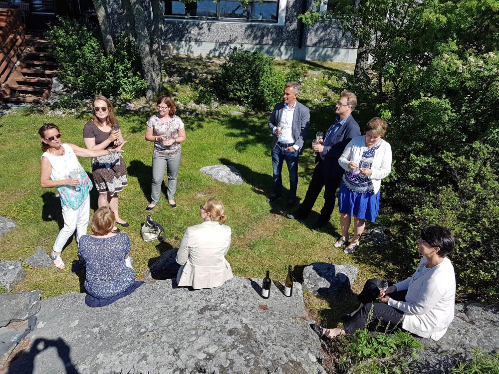 Ja meillä kaikilla oli niin mukavaa... isännät ottivat meidät vastaan sydämellisesti kuohuviinin kera. Herkuttelimme mansikkaleivoksilla. Satamajohtaja Hannu Asumalahti kertoi isoista investoinneista, jotka vieläkin käynnissä Lisää konttikenttätilaa, väylän syvennys, laiturien lisärakennusta... huomattavia muutoksia. Esityksen jälkeen kiersimme katsastamassa, miltä nyt näytti. Monet yhdestätoista mukanaolijasta olivat ensi kertaan Rauman satamassa. Kierroksen jälkeen olikin saunan ja mereen pulahtamisen aika. Kyllä virkisti! Maukkaan aterian jälkeen oli aika kiittää ja lähteä paluumatkalle.